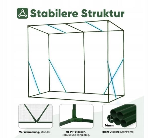 Solidna konstrukcja z ocynkowanych rur stalowych o średnicy 16 mm zapewnia stabilność i odporność na wiatr do 50 km/h. Dodatkowe linki mocujące paliki i kotwy gruntowe skutecznie zabezpieczają tunel przed przewróceniem lub przesunięciem.