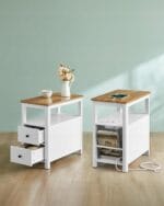 Wąska szafka nocna VASAGLE to praktyczne i stylowe rozwiązanie do sypialni, salonu lub domowego biura. Połączenie blatu w kolorze orzecha, białej konstrukcji oraz czarnych uchwytów tworzy lekki, marynistyczny styl pasujący do nowoczesnych wnętrz.