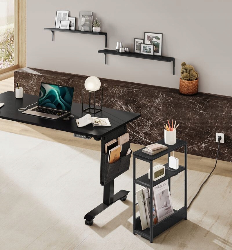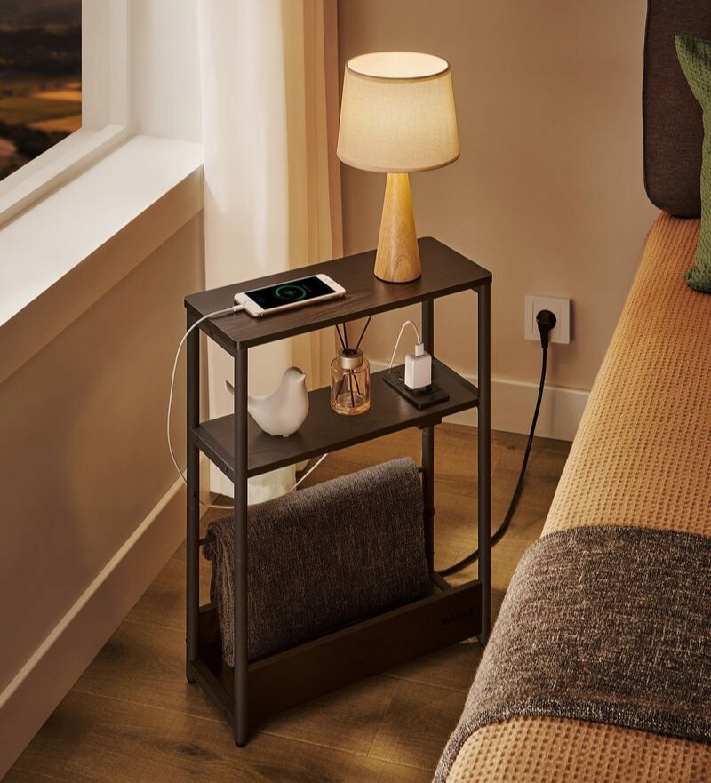 Wąski stolik nocny z gniazdkiem i USB 3 półki czarny VASAGLE