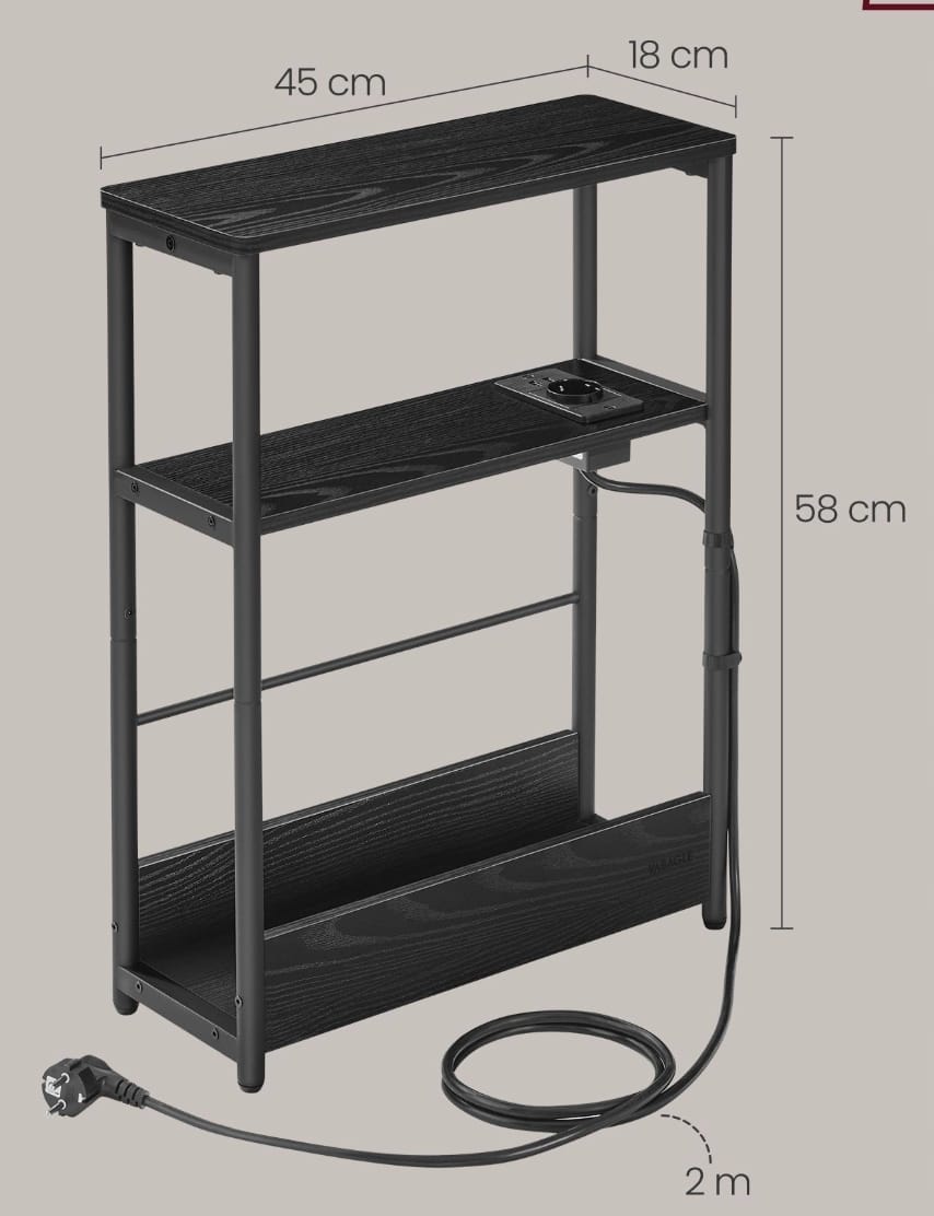 Wąski stolik nocny z gniazdkiem i USB 3 półki czarny VASAGLE