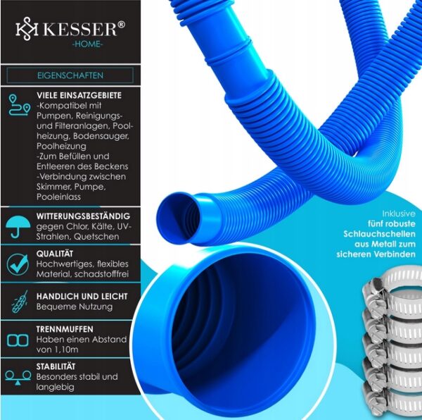✅ KESSER Wąż basenowy – wytrzymały, elastyczny, odporny na chlor, zimno, promieniowanie UV i zgniecenia, wykonany z wysokiej jakości materiałów wolnych od szkodliwych substancji. Odstęp między mufami wynosi 1,10 m, co czyni go idealnym do różnych zastosowań