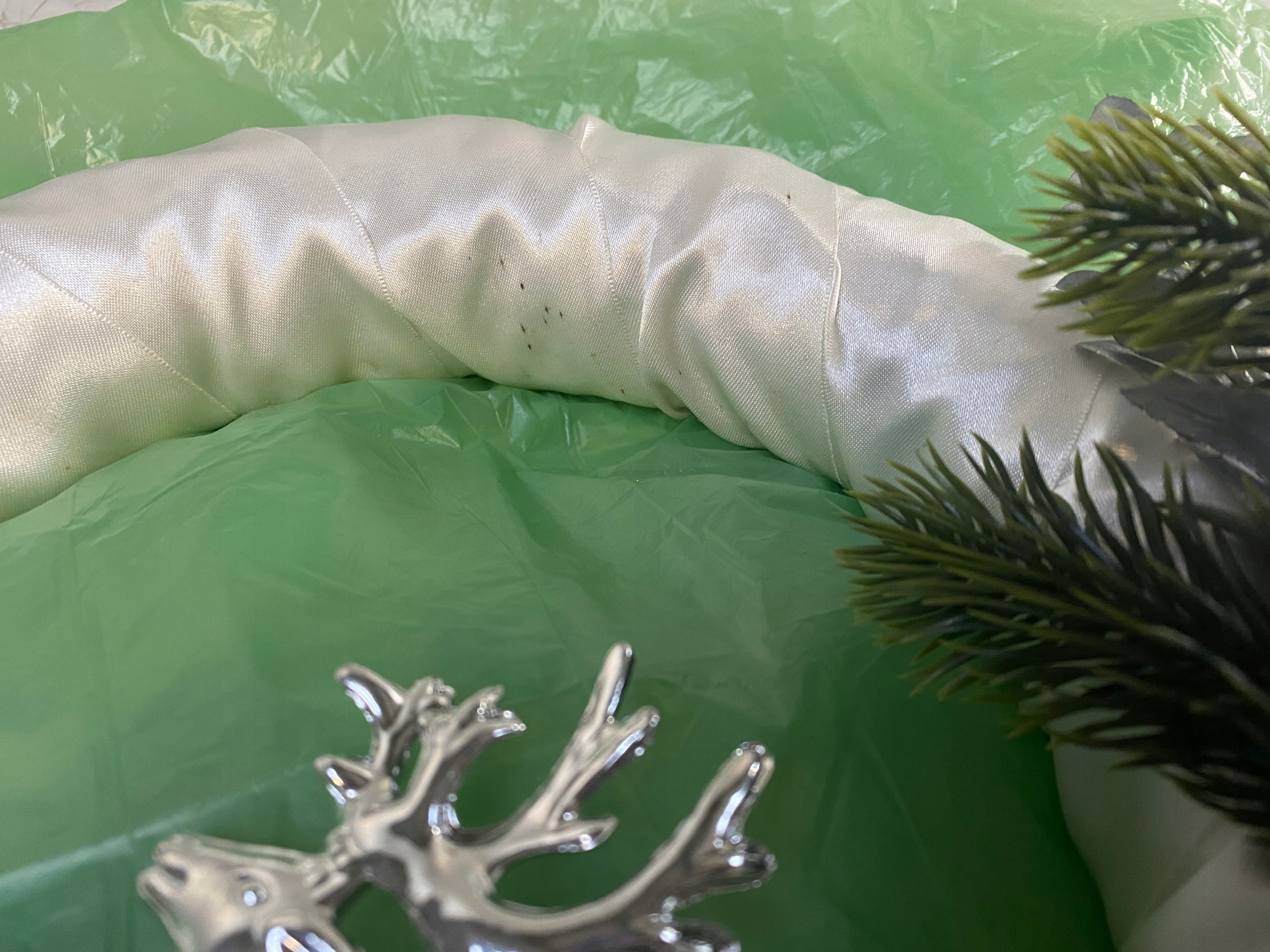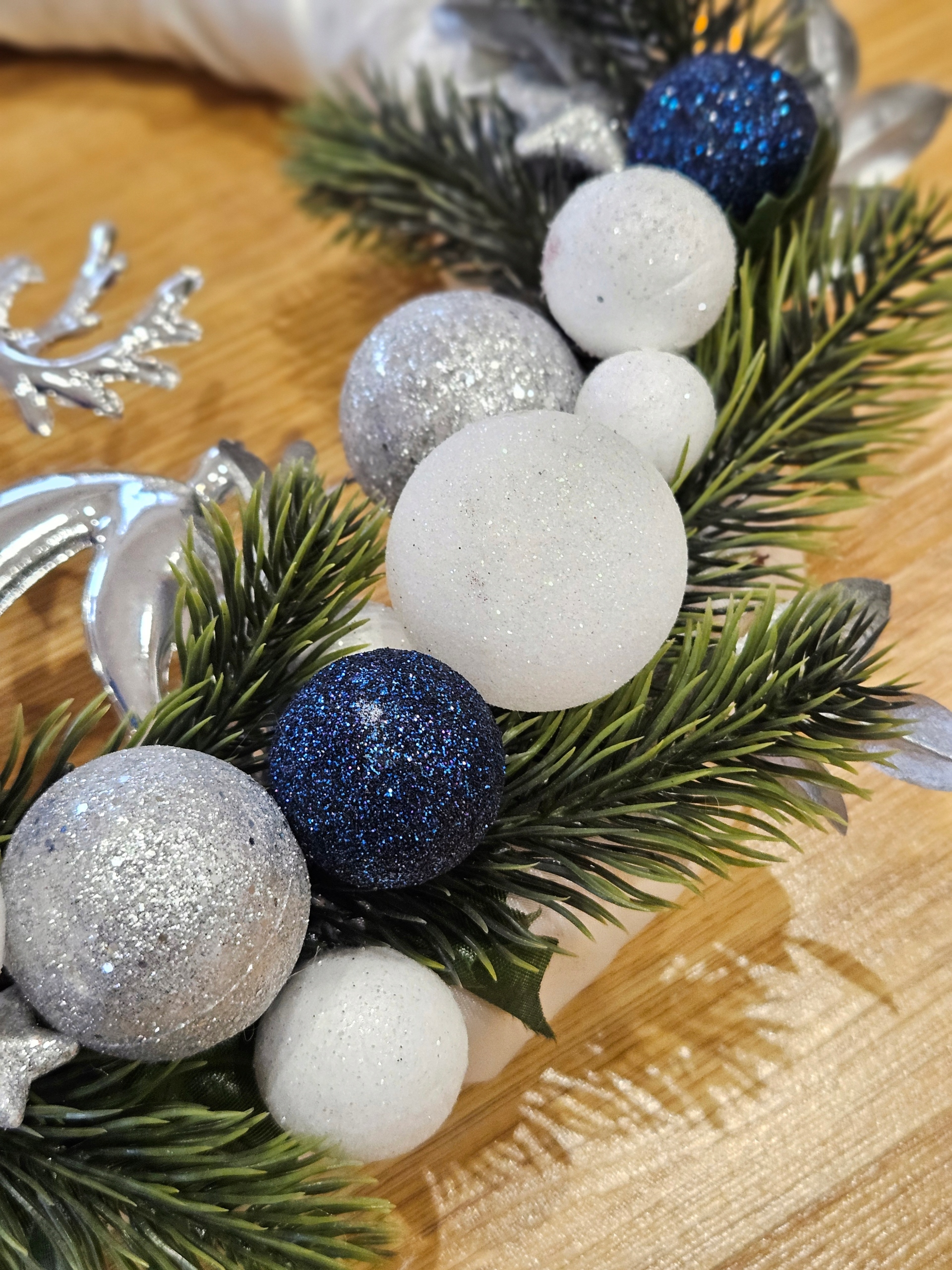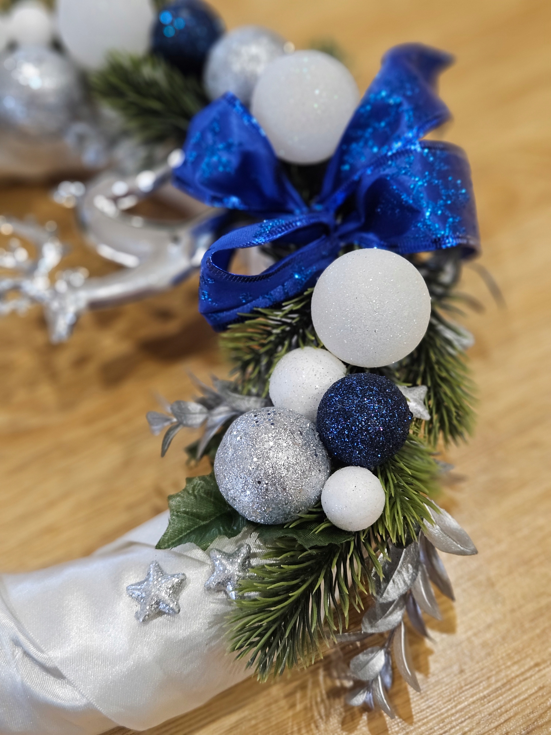 Wieniec świąteczny o średnicy 33 cm (wysokość ok. 10 cm). Wykonany na podkładzie o średnicy 30 cm owiniętym białą wstążką. Wieniec został ozdobiony gałązkami sztucznego świerku oraz dekoracjami w kolorze niebieskim, białym i srebrnym.