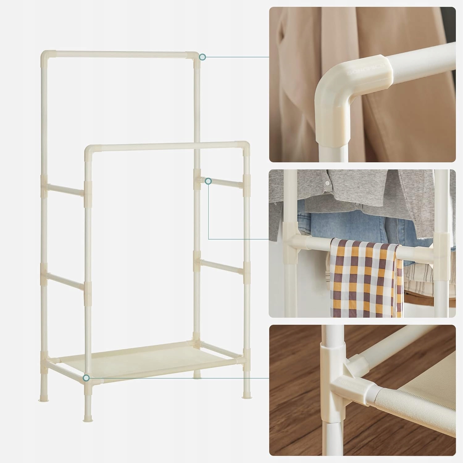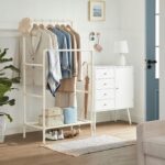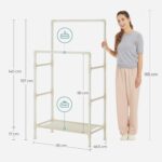 Zadbaj o porządek w swojej garderobie dzięki praktycznemu wieszakowi na ubrania SONGMICS. Podwójny drążek umożliwia wygodne przechowywanie koszul, sukienek czy spodni, a dodatkowe półki i boczne uchwyty pomieszczą buty, torby i akcesoria.
