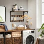 Funkcjonalny wieszak ścienny 3 w 1, który łączy półkę, drążek na ubrania oraz zestaw haczyków. To praktyczne rozwiązanie do przedpokoju, sypialni lub łazienki, które pomaga utrzymać porządek i jednocześnie stanowi stylową dekorację ściany.
