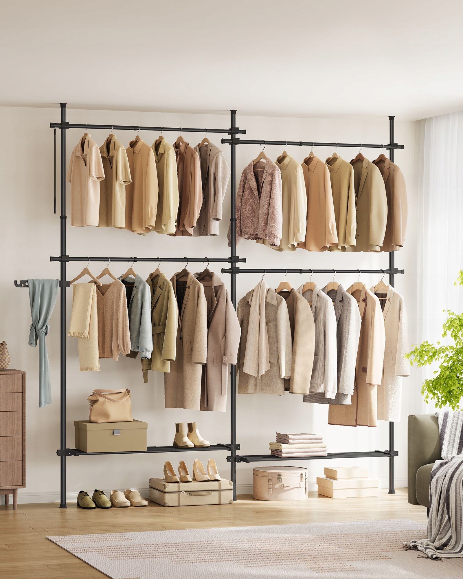 ✅ 2 drążki na ubrania, 2 półki oraz dodatkowa listwa – więcej miejsca na odzież, torby i buty