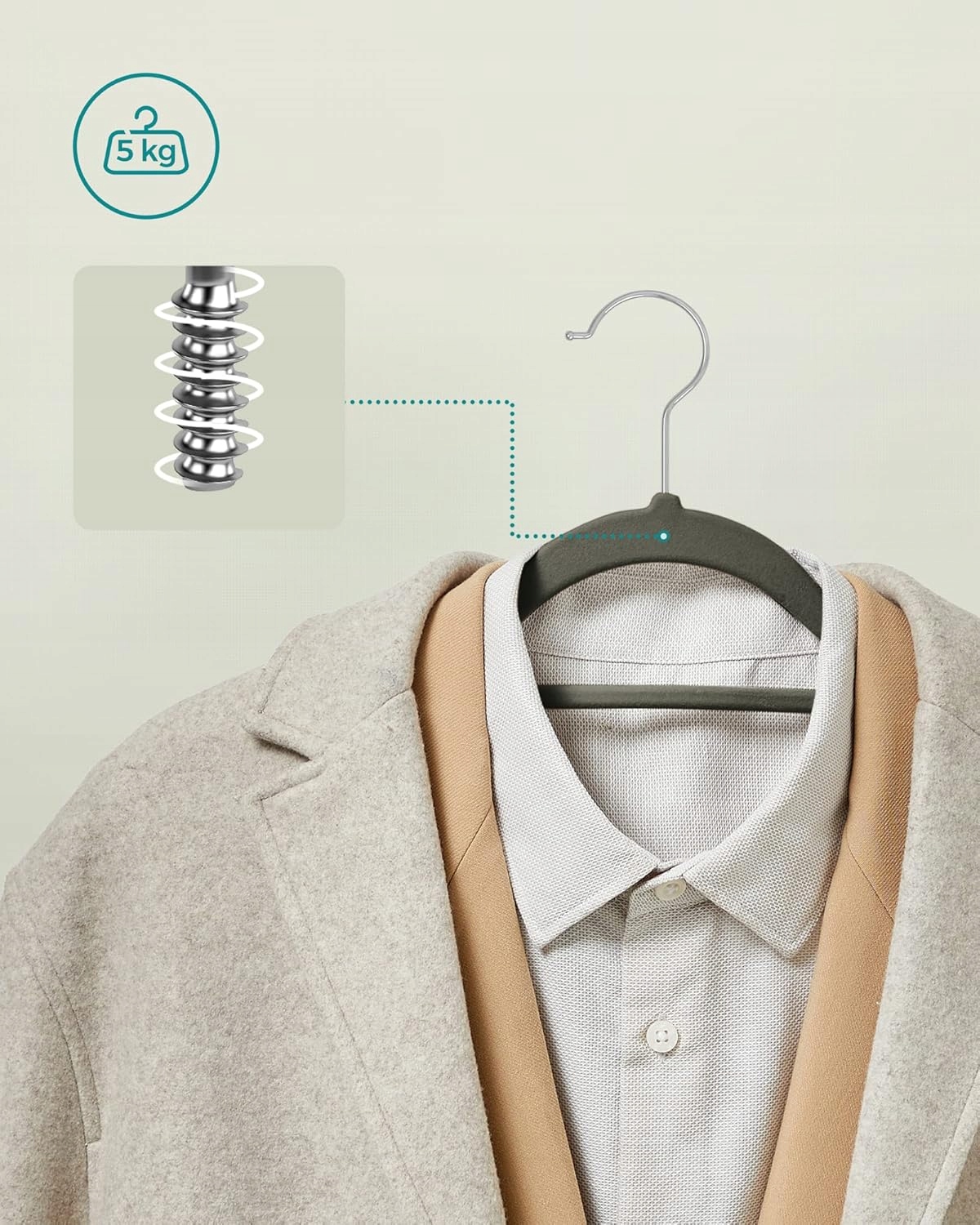 ✅ Obrotowy hak 360° – metalowy haczyk umożliwia wygodne obracanie wieszaka bez zdejmowania ubrań