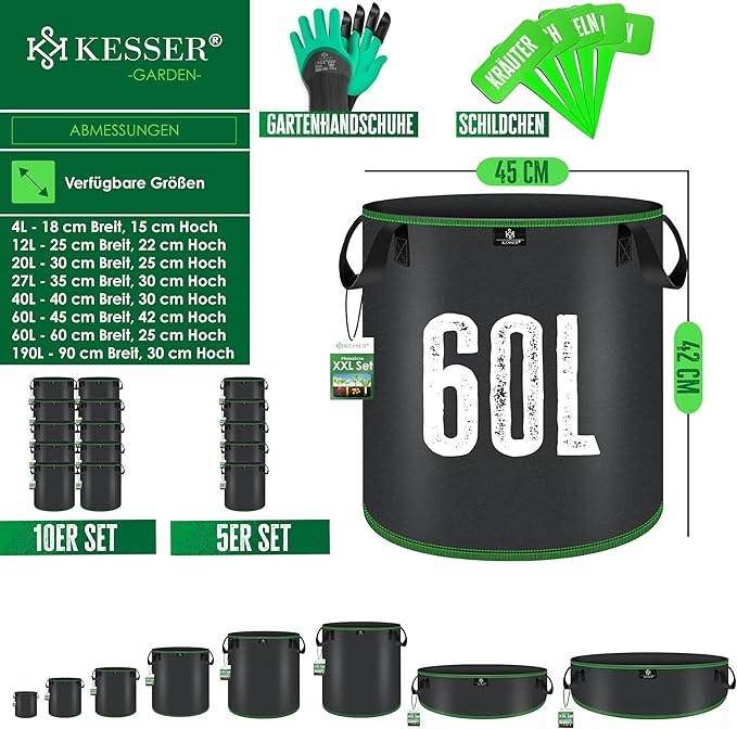 Zadbaj o porządek i efektywną uprawę roślin w ogrodzie, na tarasie, balkonie lub w domu dzięki praktycznym workom ogrodowym KESSER. Zestaw zawiera 5 pojemnych worków o pojemności 60 litrów, wykonanych z wytrzymałej, oddychającej włókniny. Idealne do uprawy warzyw, kwiatów oraz roślin ozdobnych.