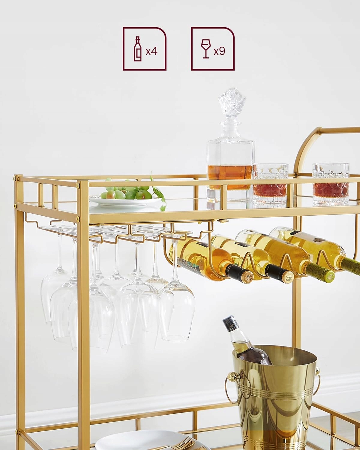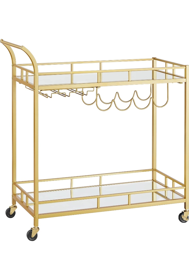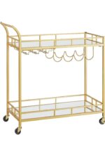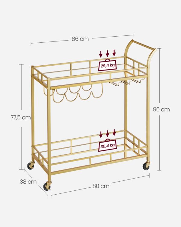 Wózek barowy na kółkach złoty 2 półki szkło uchwyt na kieliszki VASAGLE