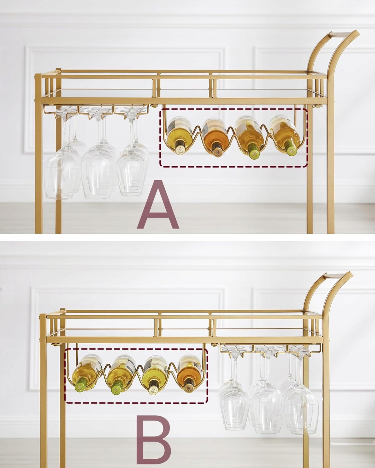 Dzięki dużej przestrzeni między półkami bez problemu pomieścisz butelki, szkło oraz akcesoria barowe. Specjalne uchwyty na kieliszki i butelki zapewniają stabilność i bezpieczeństwo podczas użytkowania.