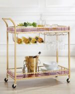 Stylowy i funkcjonalny wózek barowy, który doda elegancji każdemu wnętrzu. Złota konstrukcja w połączeniu z lustrzanymi półkami tworzy luksusowy efekt, idealny do salonu, jadalni czy kuchni.