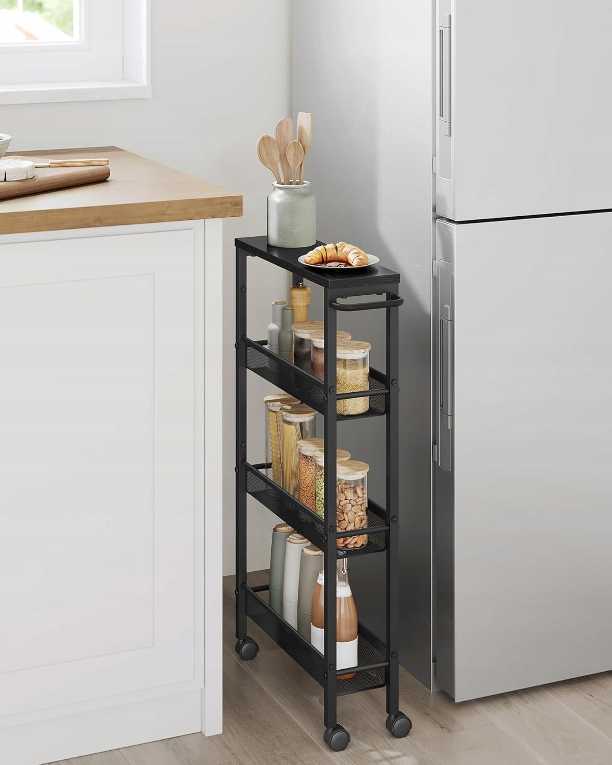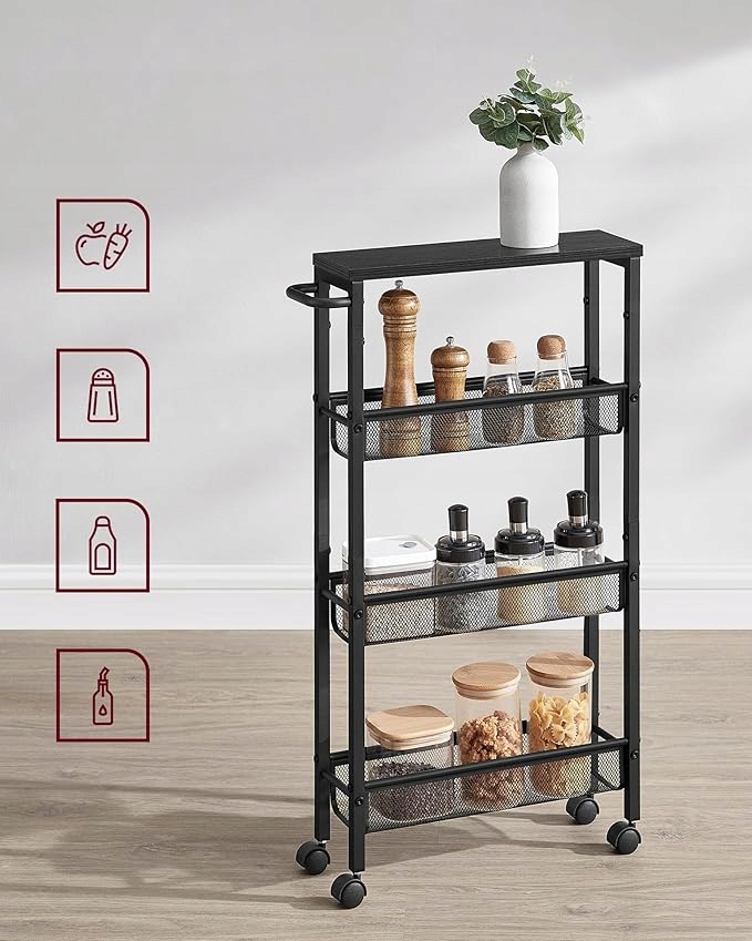 Praktyczny wąski wózek kuchenny VASAGLE to idealne rozwiązanie do małych pomieszczeń – kuchni, łazienki, salonu, biura czy sypialni. Wykorzystaj wąskie wnęki i maksymalnie zagospodaruj przestrzeń pionową.