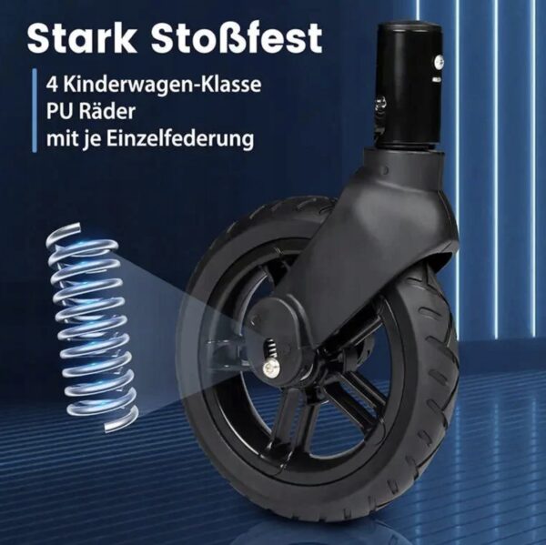 Wysokiej jakości koła PU z amortyzacją są ciche antypoślizgowe i skutecznie tłumią nierówności terenu. Zapewniają płynną jazdę zarówno po chodniku jak i po bardziej wymagającym podłożu.