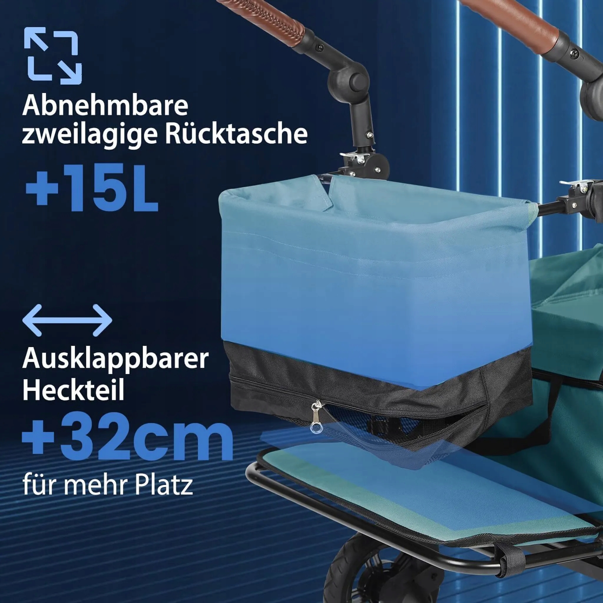 Wózek wyposażony jest w dwa pasy bezpieczeństwa 3 punktowe które zapewniają stabilną i bezpieczną jazdę dla dwójki dzieci. Rozkładany tył zwiększa przestrzeń na nogi i poprawia komfort podczas dłuższych spacerów.