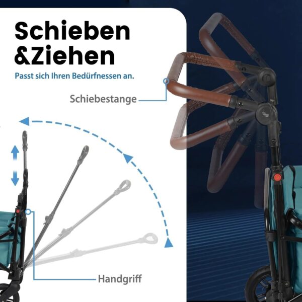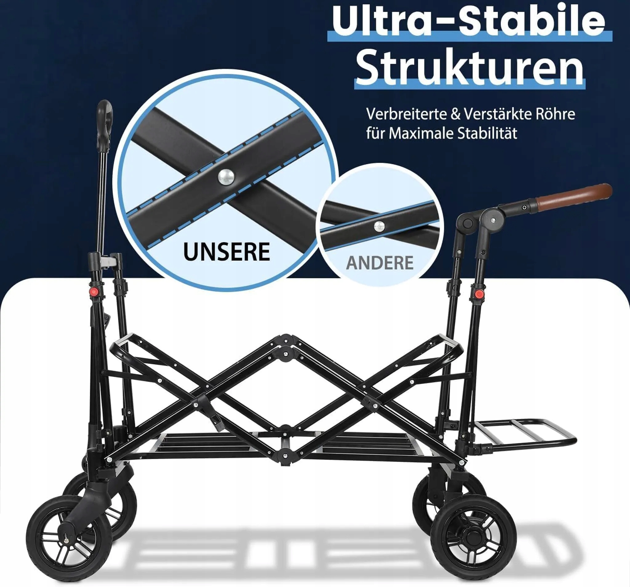 Wózek oferuje pojemną przestrzeń bagażową obejmującą główną komorę 90 litrów odpinaną tylną torbę 15 litrów oraz dodatkowe kieszenie z przodu. Idealny na zakupy wycieczki i codzienne potrzeby.