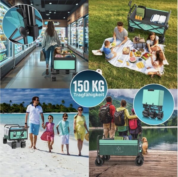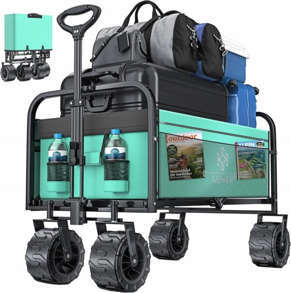 Wielofunkcyjny, składany wózek transportowy marki KESSER® to niezastąpiony towarzysz podczas wycieczek, zakupów, grillowania, biwakowania, festiwali oraz innych aktywności na świeżym powietrzu. Dzięki solidnej konstrukcji ze stalowych rur malowanych proszkowo oraz przestronnej powierzchni ładunkowej, bez problemu przewieziesz nawet większy bagaż, sprzęt lub zakupy. Maksymalna nośność wynosi aż 150 kg.