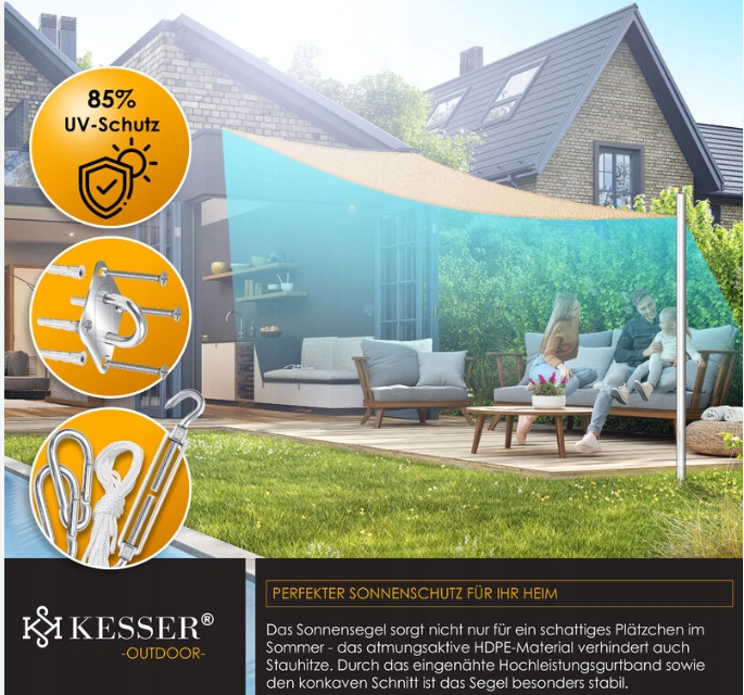 Żagiel zacieniający KESSER wykonany z wytrzymałego, odpornego na warunki atmosferyczne HDPE, oddychająca tkanina zapobiega gromadzeniu się ciepła, współczynnik zacienienia ok. 85%, wszechstronne zastosowanie dla idealnego zacienienia, łatwy montaż.