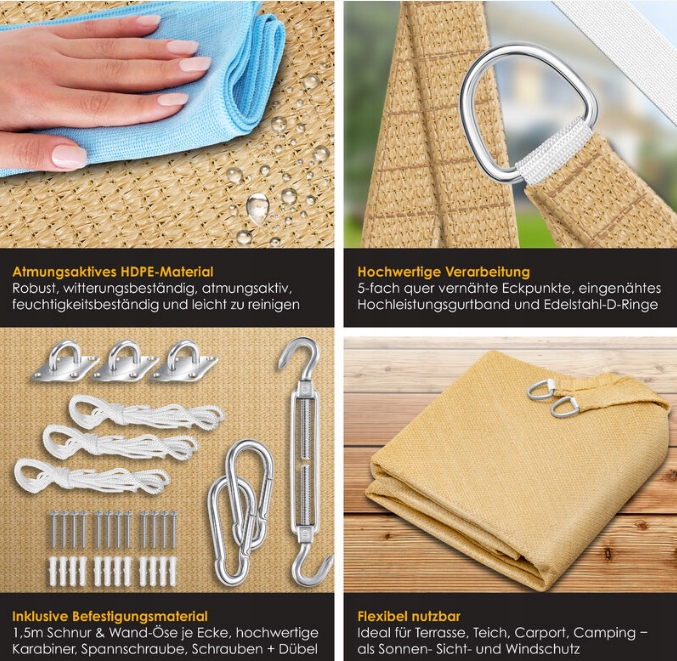✅ Wklęsły krój zapewnia, że żagiel zacieniający jest schludny i napięty. Dzięki wklęsłemu kształtowi naprężenie jest przenoszone na zewnątrz do narożników. Zapobiega to powstawaniu zmarszczek i zwiotczeniu tkaniny. Wysokowydajna taśma jest stale wszyta w obszycia, dzięki czemu osłona przeciwsłoneczna jest jeszcze mocniejsza. Narożniki są pogrubione i kilkakrotnie zszyte oraz wyposażone w D-ringi ze stali nierdzewnej.
