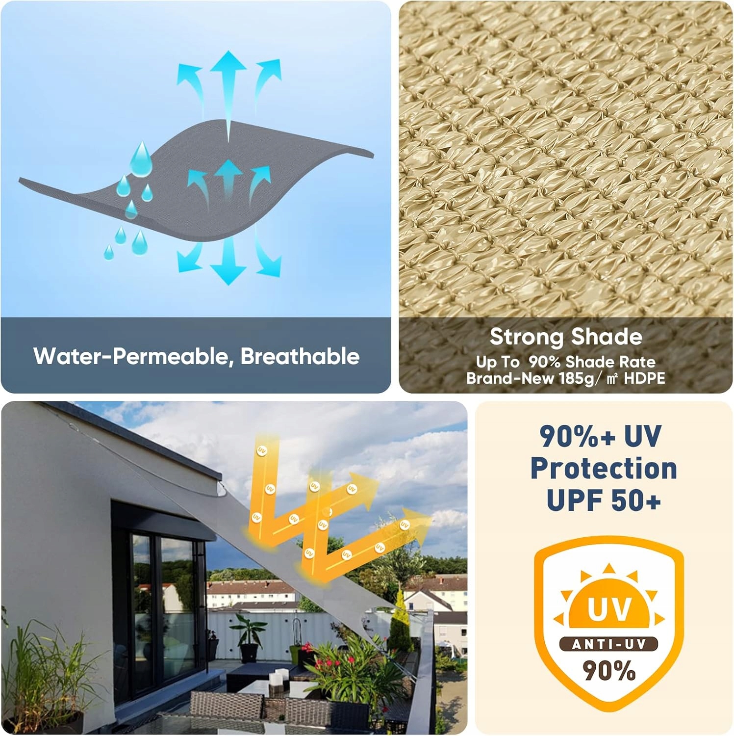 ✅ OCHRONA PRZECIWSŁOŃCOWA, CIEŃ – Unikalna dzianina HDPE blokuje do 90% szkodliwych promieni UV słońca. Unikaj uszkodzeń skóry przez promieniowanie UV i ciesz się odcieniem. Jednocześnie pozwala na przejście odrobiny światła, nie czyniąc obszaru zbyt ciemnym. Dzięki niemu możesz cieszyć się przyjemnym zacienionym leżakiem na patio lub w ogrodzie.