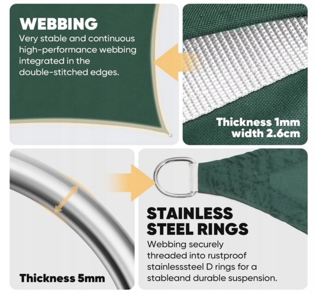 ✅ Żagiel ma podwójnie zszyte krawędzie i wzmocnione rogi zapewniające długą żywotność. Markizy mają zakrzywienie na krawędziach, aby zbudować napięcie przez żagiel. Podczas gdy rogi żagla są rozciągnięte, łuki krawędzi próbują się wyprostować. Taka konstrukcja nie tylko poprawia wytrzymałość na rozciąganie.