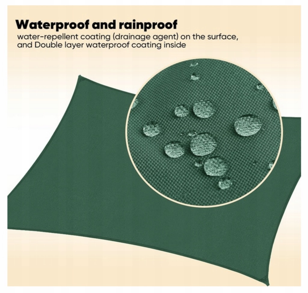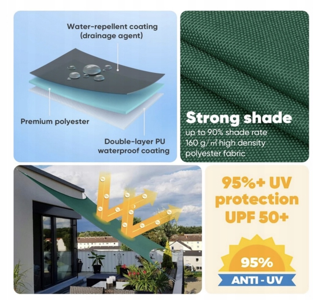 ✅ Przeciwsłoneczny żagiel w 100% wykonany z wysokiej jakości i gęstej tkaniny poliestrowej, wodoodporny materiał na powierzchni, podwójna powłoka PU wewnątrz, trwała i bezpieczna. Jest odporny na światło, wodoodporny, rozdarcia, odporny na warunki atmosferyczne i wolny od pleśni i plam.