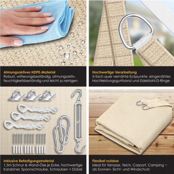 Wysokiej jakości żagiel przeciwsłoneczny KESSER wykonany z wytrzymałego materiału HDPE, zapewniający 85% ochrony UV i wodoodporność. Idealny na taras, balkon, do ogrodu czy na kemping. Dzięki wklęsłemu cięciu materiał rozciąga się równomiernie, zapobiegając marszczeniom i zwisaniu. Jest odporny na warunki atmosferyczne, szybko schnie i zapewnia ochronę przed deszczem.