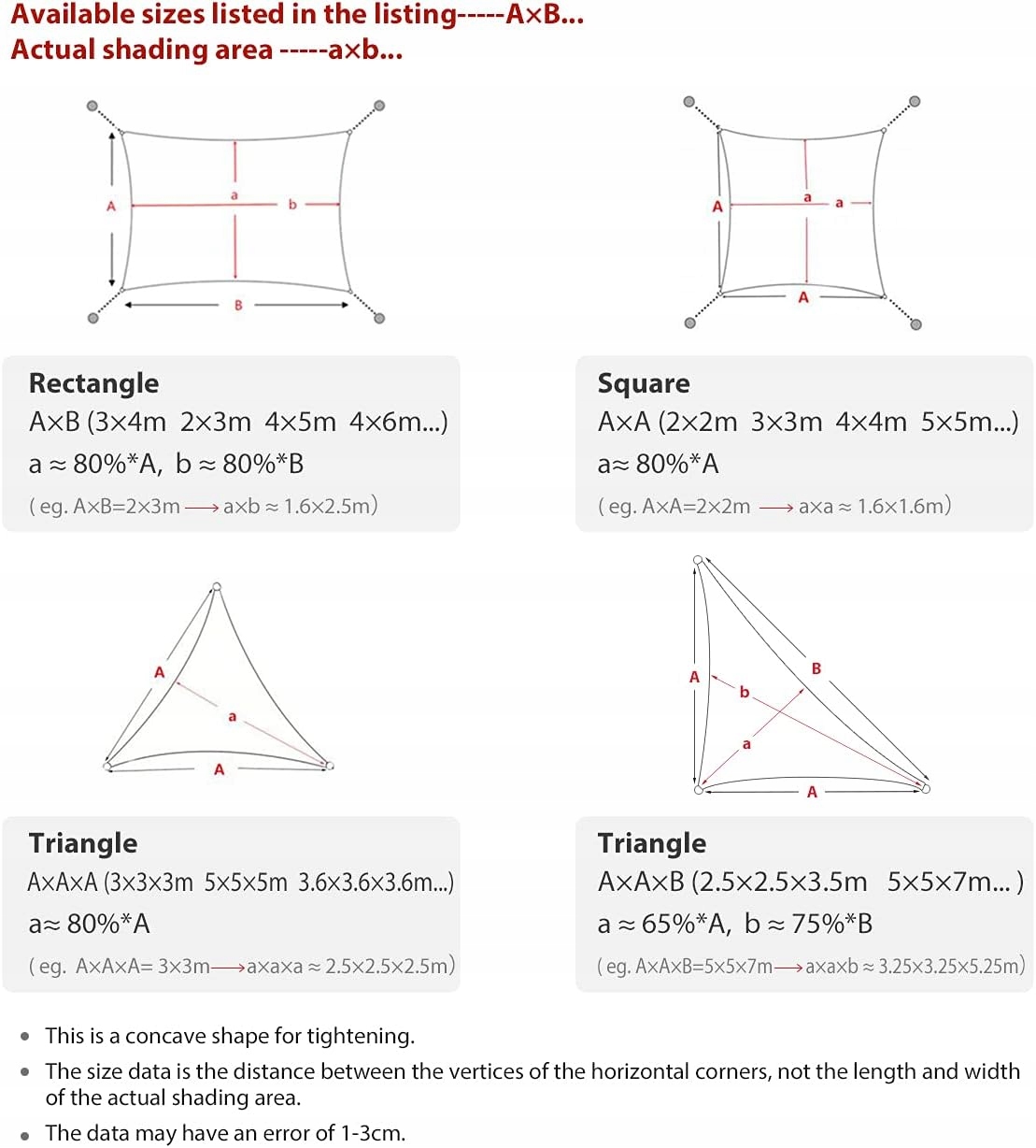 ✅ W zestawie zawiera długie liny i metalowe D-ringi. Ze względu na wklęsły kształt środkowa szerokość żagla jest krótsza, a rzeczywista powierzchnia cieniowania mniejsza. Dane dotyczące rozmiaru to odległość między punktami korony poziomych narożników, a nie długość i szerokość rzeczywistego obszaru cienia. Zaleca się mieć odległość około 45 – 60 cm od rogu tkaniny do punktu ściany/usztywnienia. Kąt montażu wynosi 20 – 42 stopnie, aby deszcz mógł spłynąć.