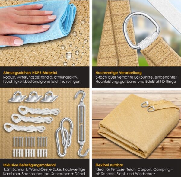Stwórz swój własny raj na zewnątrz! Ponieważ żagle przeciwsłoneczne zapewniają 85% ochronę przed promieniowaniem UV, wiesz, że Twoje bawiące się dzieci są również dobrze chronione przed szkodliwymi promieniami. Tkanina HDPE (polietylen o wysokiej gęstości) waży 185 g/m² i jest odporna na rozdarcia i warunki atmosferyczne. Co więcej, szybko schnie, pozostaje odporny na pleśń i gnicie.