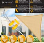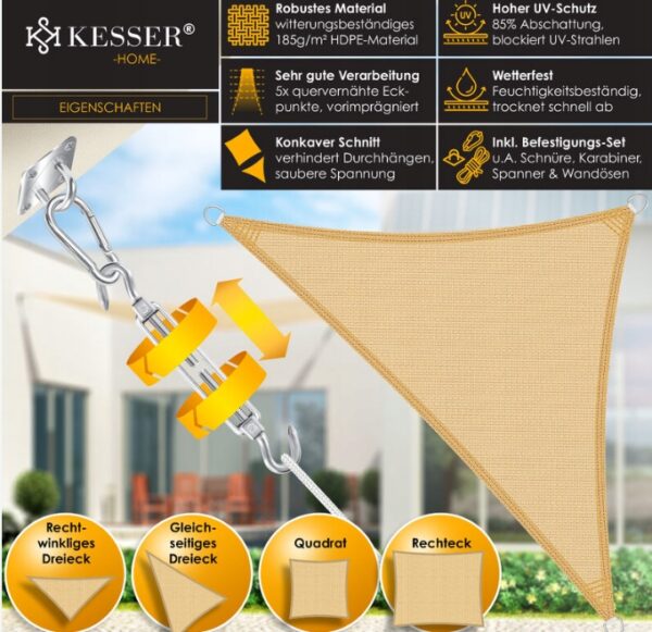 Żagiel zacieniający KESSER wykonany z wytrzymałego, odpornego na warunki atmosferyczne HDPE, oddychająca tkanina zapobiega gromadzeniu się ciepła, współczynnik zacienienia ok. 85%, wszechstronne zastosowanie dla idealnego zacienienia, łatwy montaż.