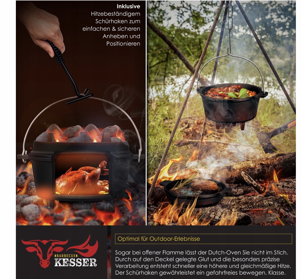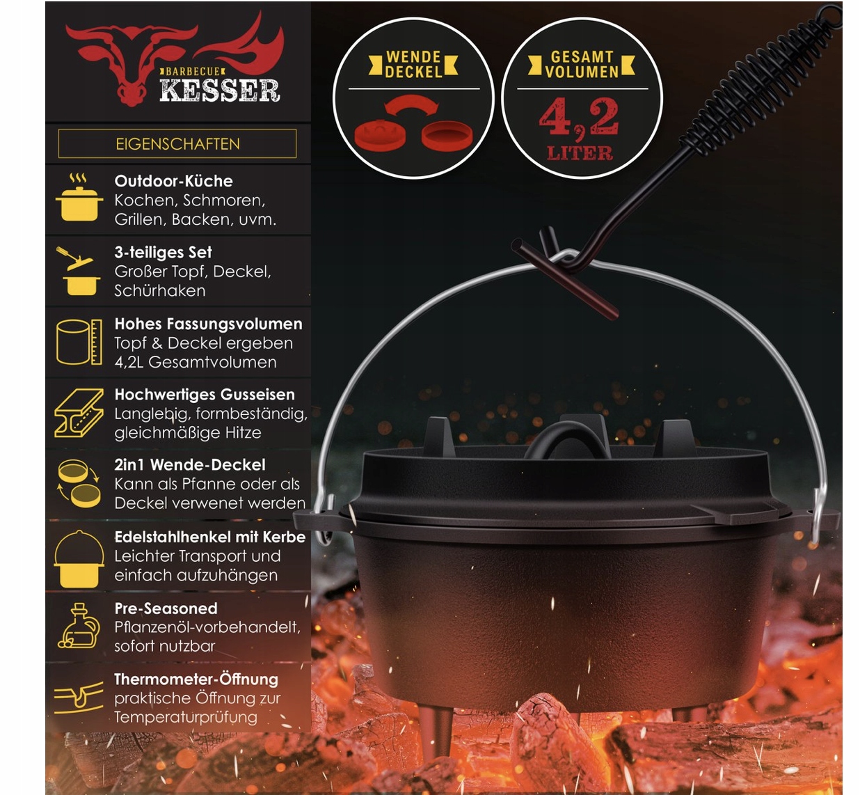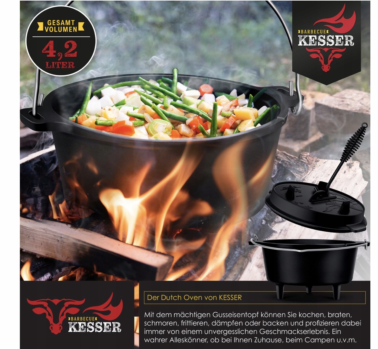KESSER Premium Dutch Oven BBQ – wykonany z żeliwa, z hakiem żaroodpornym i pokrywką z uchwytem do przenoszenia.