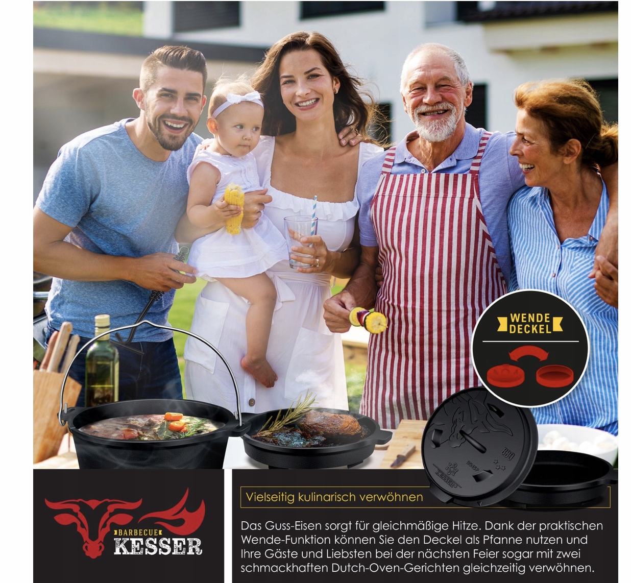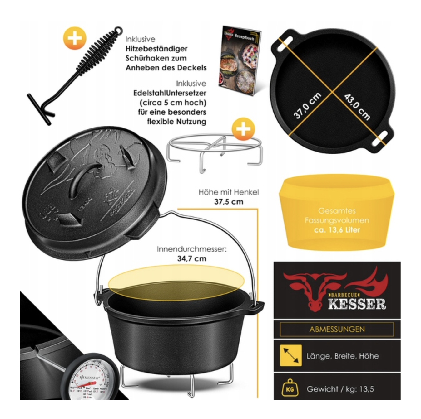 KESSER® Żeliwny garnek do piekarnika holenderskiego z pokrywką do grillowania na zewnątrz i wewnątrz Wielofunkcyjny zestaw do gotowania – Patelnia do grilla – Zapiekanka dla 8-14 osób z nóżkami 13,6 l
