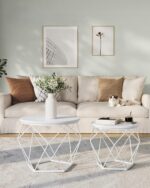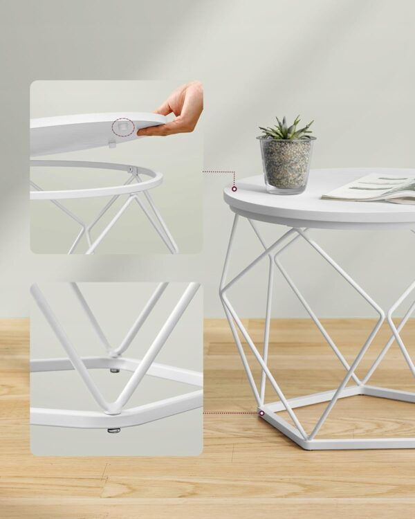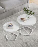 Nowoczesny zestaw 2 stolików kawowych VASAGLE to stylowe i funkcjonalne rozwiązanie do salonu, sypialni lub strefy relaksu. Okrągłe blaty w białym kolorze oraz geometryczna stalowa podstawa tworzą elegancki, loftowy charakter, który przyciąga wzrok.