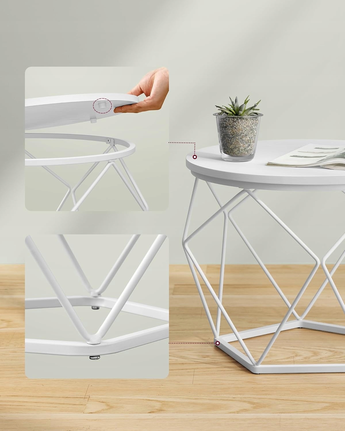 Stoliki świetnie sprawdzą się jako miejsce na kawę, dekoracje, rośliny doniczkowe czy laptopa do pracy. Możesz ustawić je razem, tworząc spójną aranżację, lub rozdzielić – jeden przy sofie, drugi w sypialni.