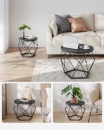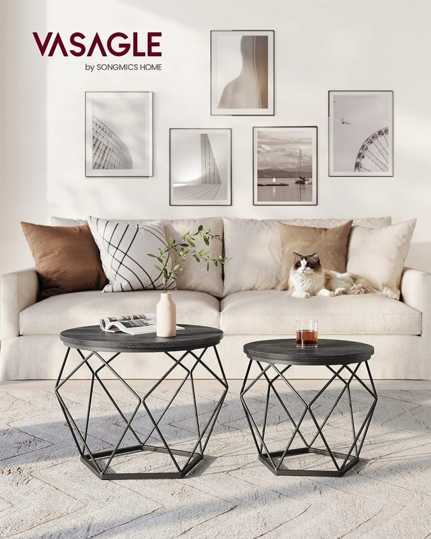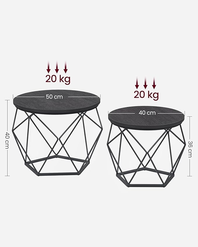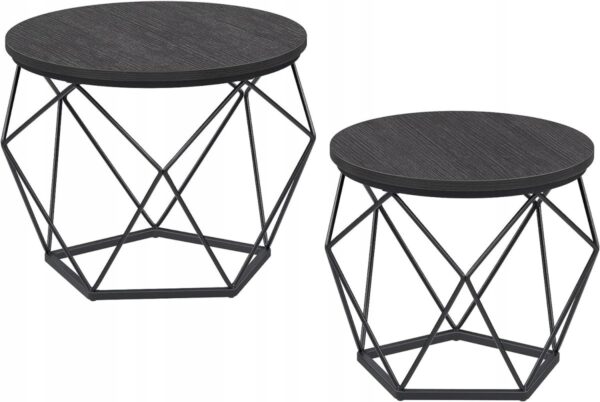 Nowoczesny zestaw 2 stolików kawowych VASAGLE to stylowe i funkcjonalne rozwiązanie do salonu, sypialni lub strefy relaksu. Okrągłe blaty w czarnym kolorze oraz geometryczna stalowa podstawa tworzą elegancki, loftowy charakter, który przyciąga wzrok.