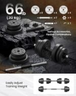 Kompletny zestaw hantli SONGMICS to idealne rozwiązanie do treningu w domu lub w siłowni. Regulowane ciężary pozwalają dostosować obciążenie do Twoich potrzeb, a dodatkowy drążek umożliwia przekształcenie hantli w sztangę.