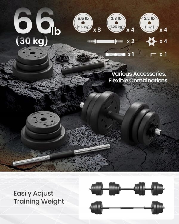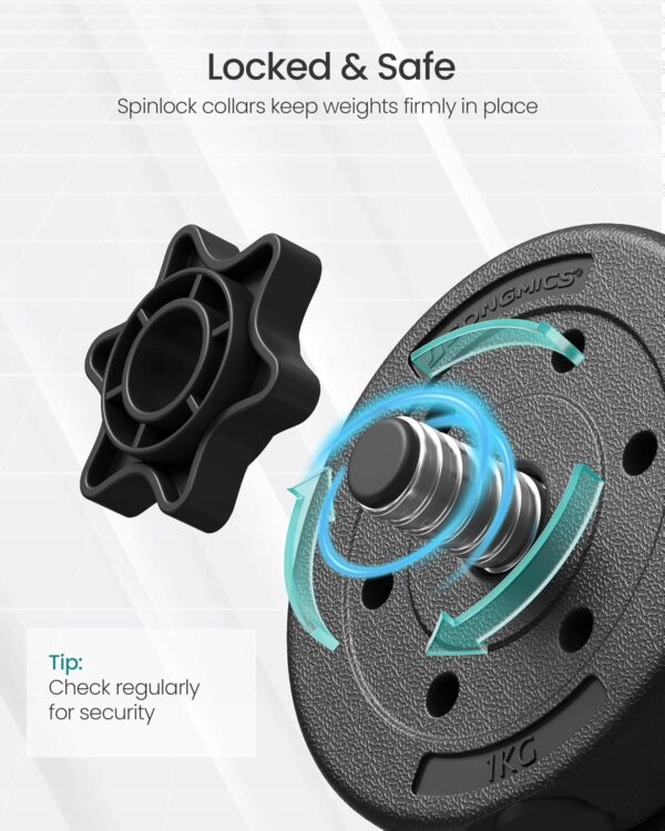 Kompletny zestaw hantli SONGMICS to idealne rozwiązanie do treningu w domu lub w siłowni. Regulowane ciężary pozwalają dostosować obciążenie do Twoich potrzeb, a dodatkowy drążek umożliwia przekształcenie hantli w sztangę.