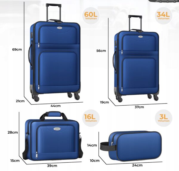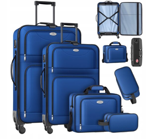 - Zestaw 4w1: duża walizka, średnia walizka, bagaż podręczny, kosmetyczka
